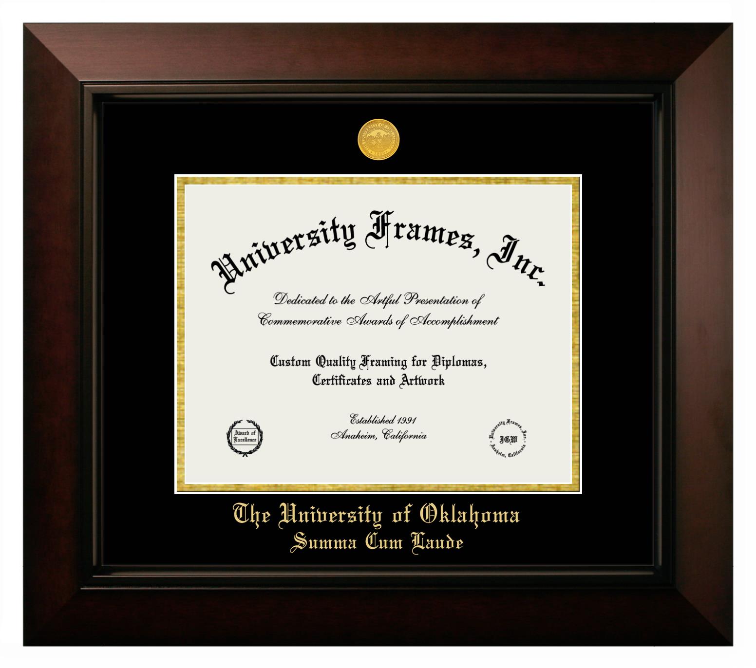 We believe that earning a degree is a huge accomplishment and showcasing it is important. Therefore, if you are looking for University of Oklahoma Summa Cum Laude diploma or degree frames for yourself or a recent University of Oklahoma Summa Cum Laude grad, we are sure you will love our custom diploma frames. Our diploma frames are made with the official University of Oklahoma Summa Cum Laude seal and are beautifully crafted. Start designing your frame now!