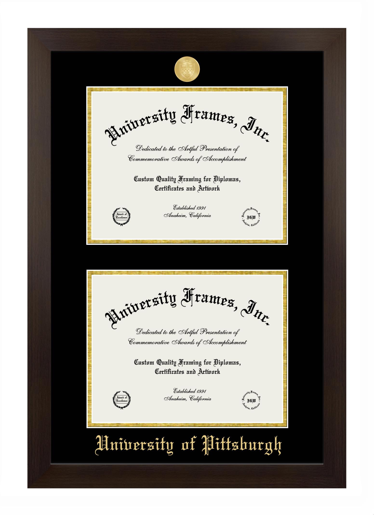 We believe that earning a degree is a huge accomplishment and showcasing it is important. Therefore, if you are looking for University of Pittsburgh diploma or degree frames for yourself or a recent University of Pittsburgh grad, we are sure you will love our custom diploma frames. Our diploma frames are made with the official University of Pittsburgh seal and are beautifully crafted. Start designing your frame now!
