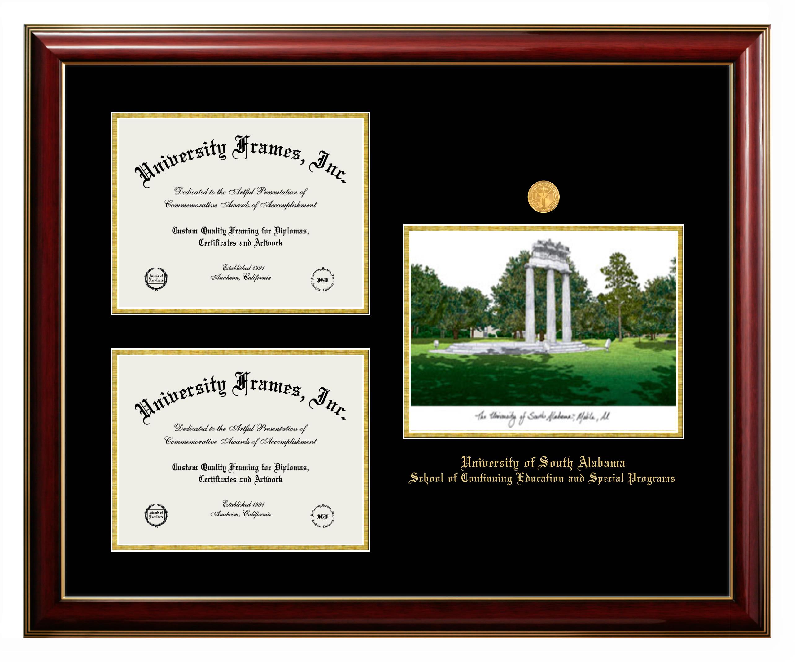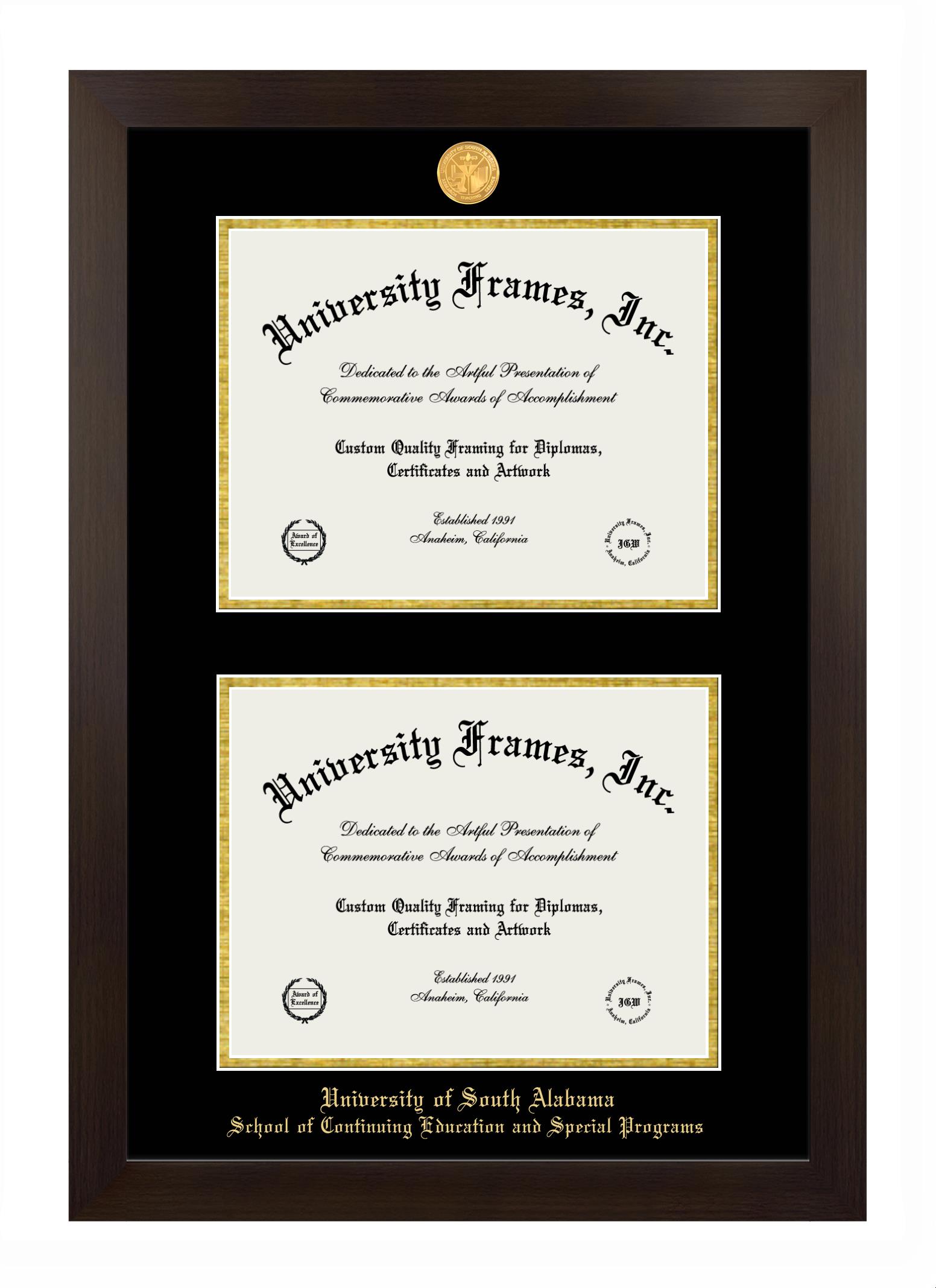 We believe that earning a degree is a huge accomplishment and showcasing it is important. Therefore, if you are looking for University of South Alabama School of Continuing Education and Special Programs diploma or degree frames for yourself or a recent University of South Alabama School of Continuing Education and Special Programs grad, we are sure you will love our custom diploma frames. Our diploma frames are made with the official University of South Alabama School of Continuing Education and Special Programs seal and are beautifully crafted. Start designing your frame now!