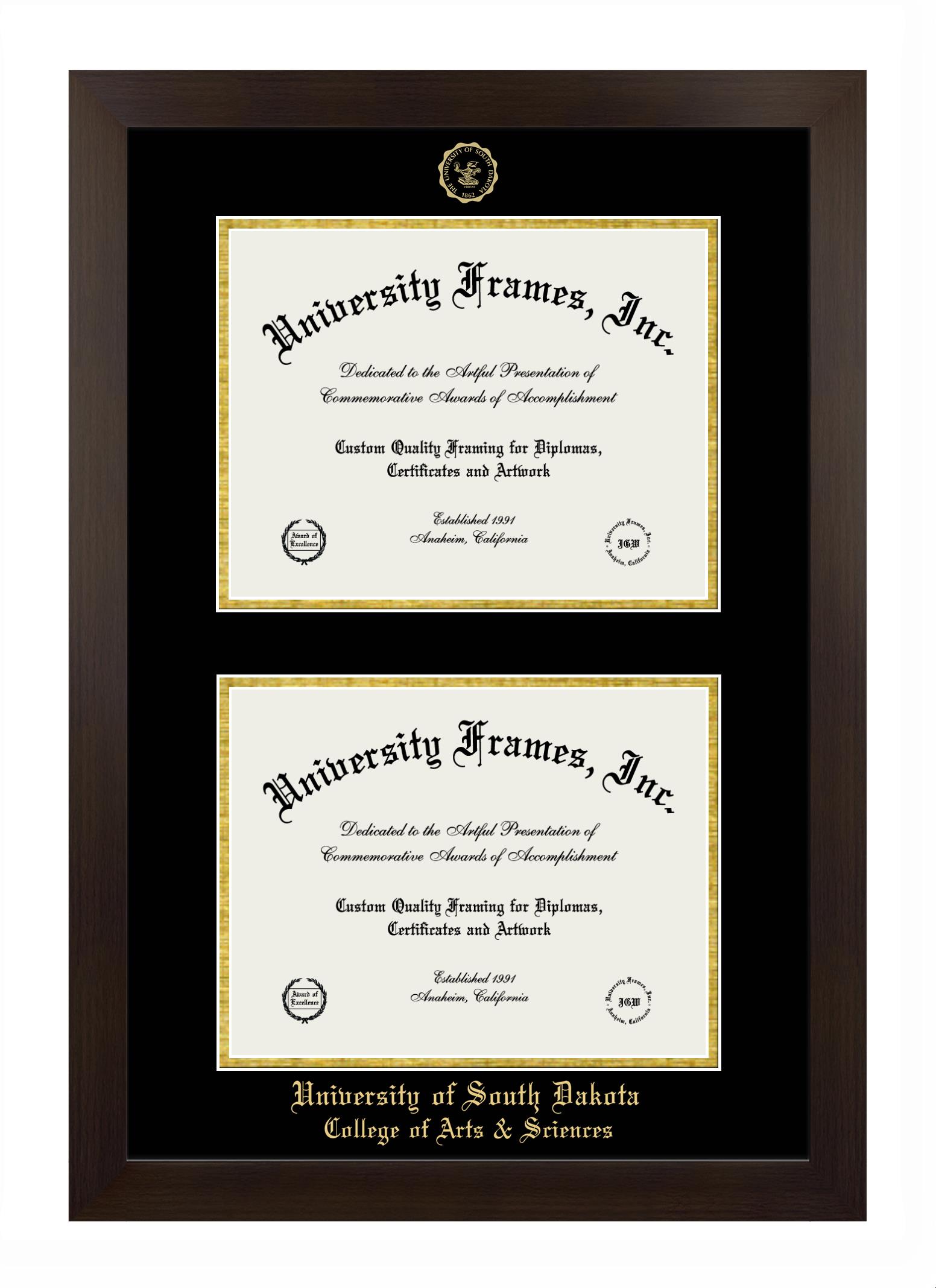 We believe that earning a degree is a huge accomplishment and showcasing it is important. Therefore, if you are looking for University of South Dakota College of Arts & Sciences diploma or degree frames for yourself or a recent University of South Dakota College of Arts & Sciences grad, we are sure you will love our custom diploma frames. Our diploma frames are made with the official University of South Dakota College of Arts & Sciences seal and are beautifully crafted. Start designing your frame now!
