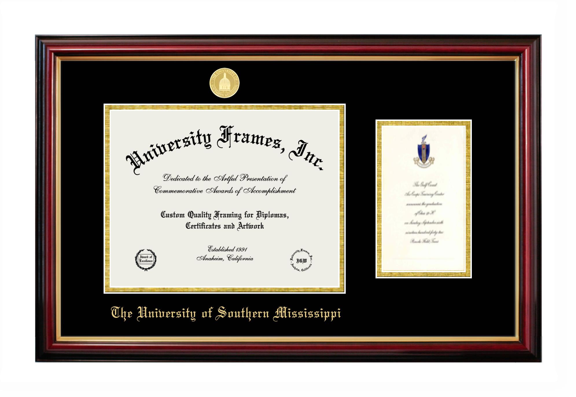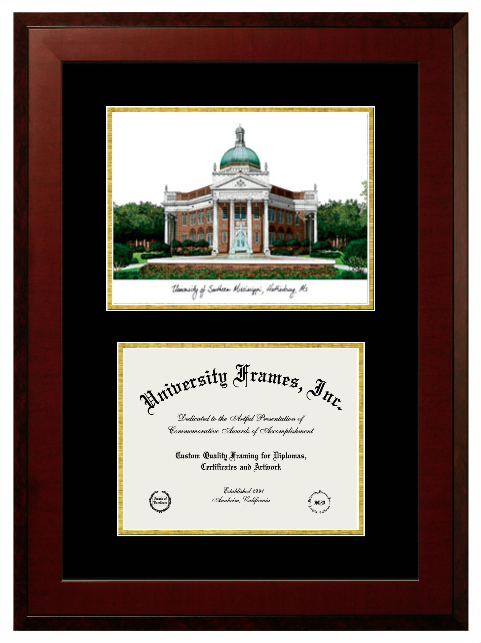 University of Southern Mississippi diploma frames and degree frames are the perfect graduation gifts for recent grads, or anyone who wants to preserve and display their hard-earned accomplishments. Our custom diploma frames are specifically made with the official University of Southern Mississippi seal and are handcrafted to meet high-quality standards. We guarantee that you will love our graduation frames. Start customizing your frame now!