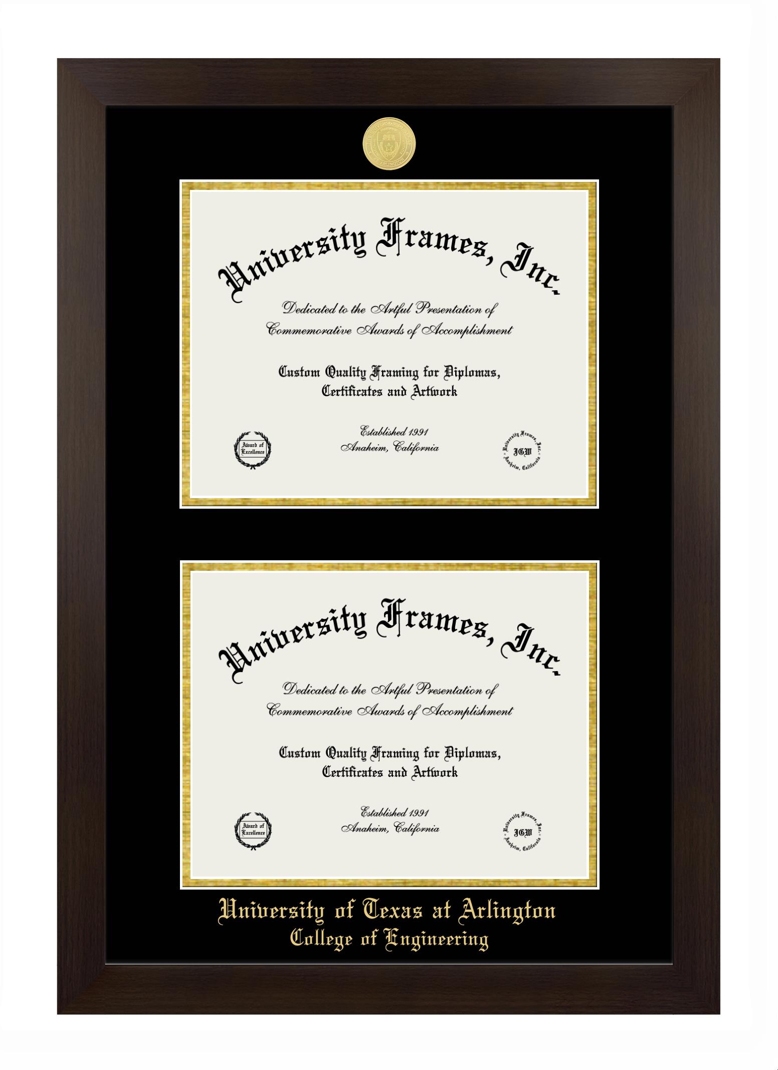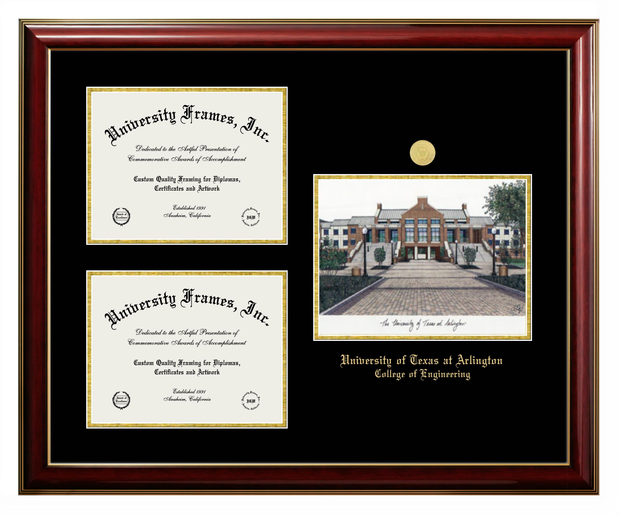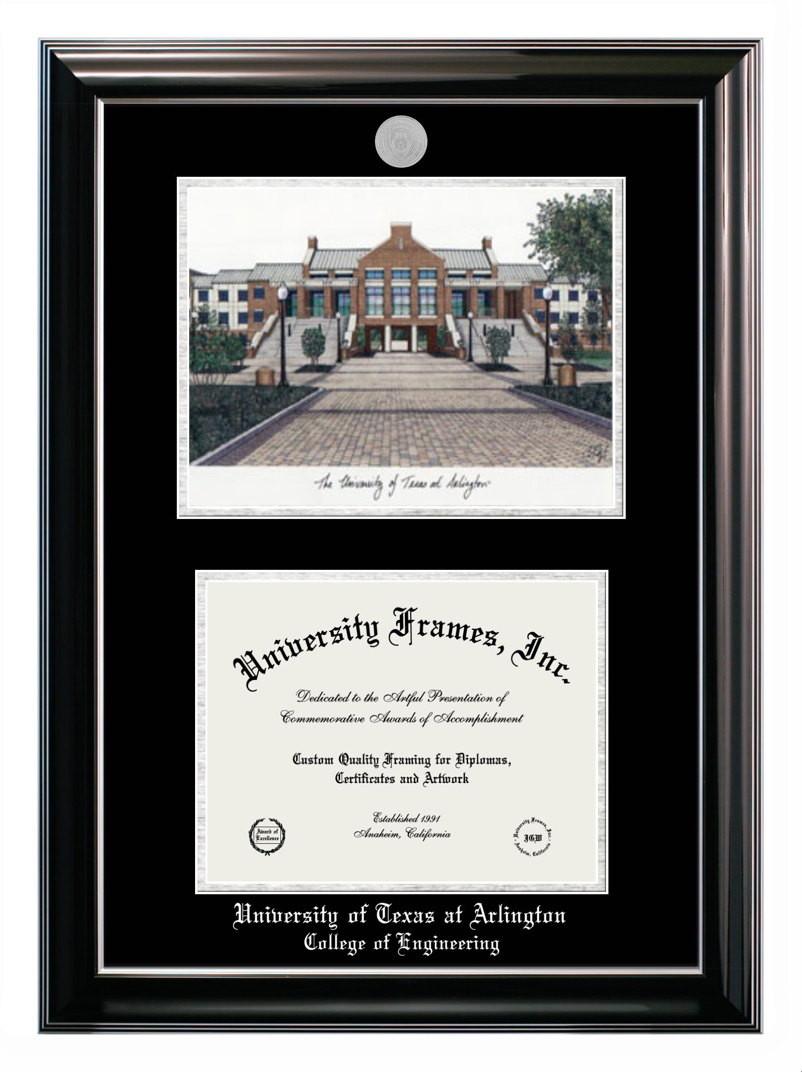University of Texas at Arlington College of Engineering diploma frames and degree frames are the perfect graduation gifts for recent grads, or anyone who wants to preserve and display their hard-earned accomplishments. Our custom diploma frames are specifically made with the official University of Texas at Arlington College of Engineering seal and are handcrafted to meet high-quality standards. We guarantee that you will love our graduation frames. Start customizing your frame now!