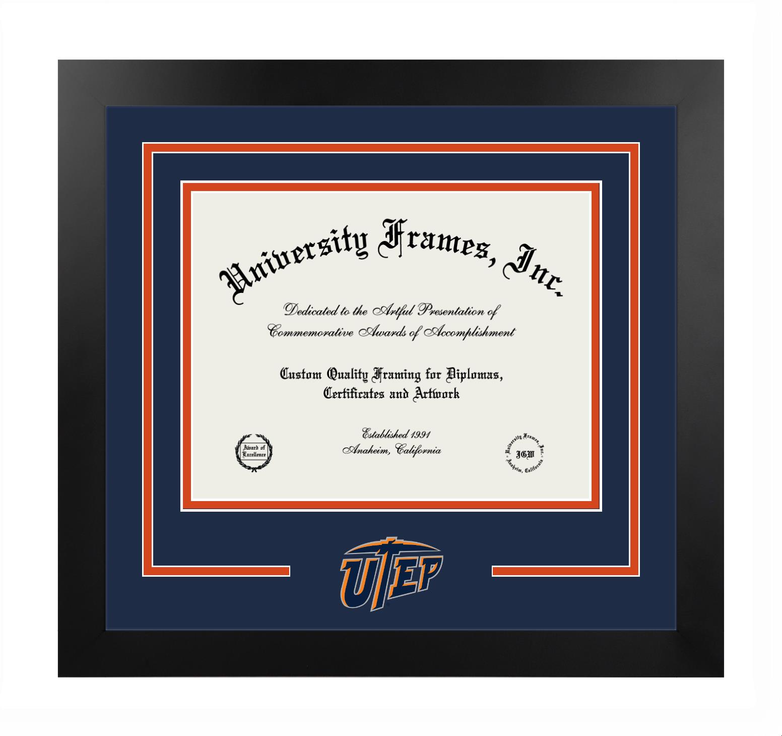 University of Texas at El Paso diploma frames and degree frames are the perfect graduation gifts for recent grads, or anyone who wants to preserve and display their hard-earned accomplishments. Our custom diploma frames are specifically made with the official University of Texas at El Paso seal and are handcrafted to meet high-quality standards. We guarantee that you will love our graduation frames. Start customizing your frame now!