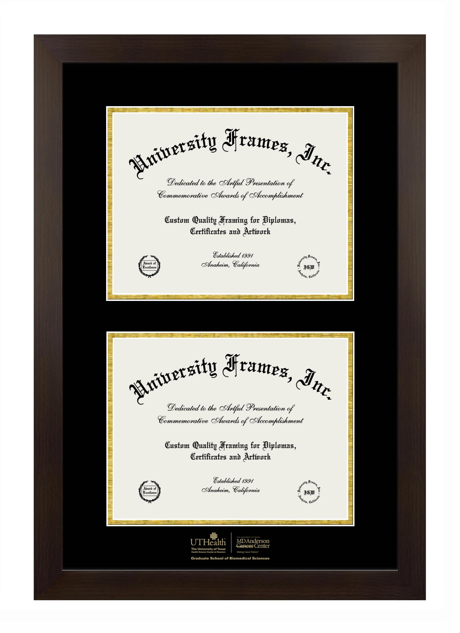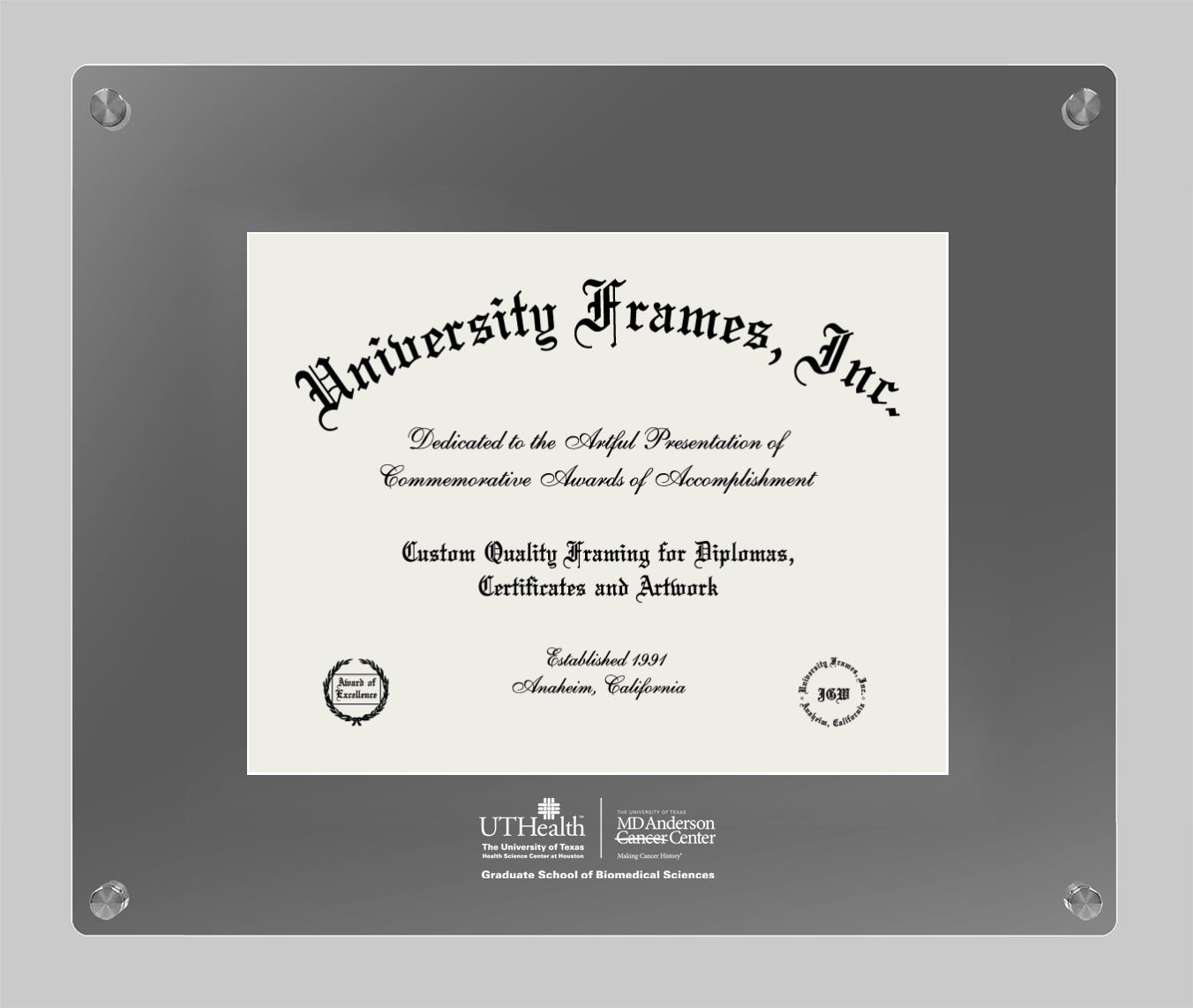 University of Texas Health Science Center at Houston MD Anderson Cancer Center Graduate School of Biomedical Sciences diploma frames and degree frames are the perfect graduation gifts for recent grads, or anyone who wants to preserve and display their hard-earned accomplishments. Our custom diploma frames are specifically made with the official University of Texas Health Science Center at Houston MD Anderson Cancer Center Graduate School of Biomedical Sciences seal and are handcrafted to meet high-quality standards. We guarantee that you will love our graduation frames. Start customizing your frame now!