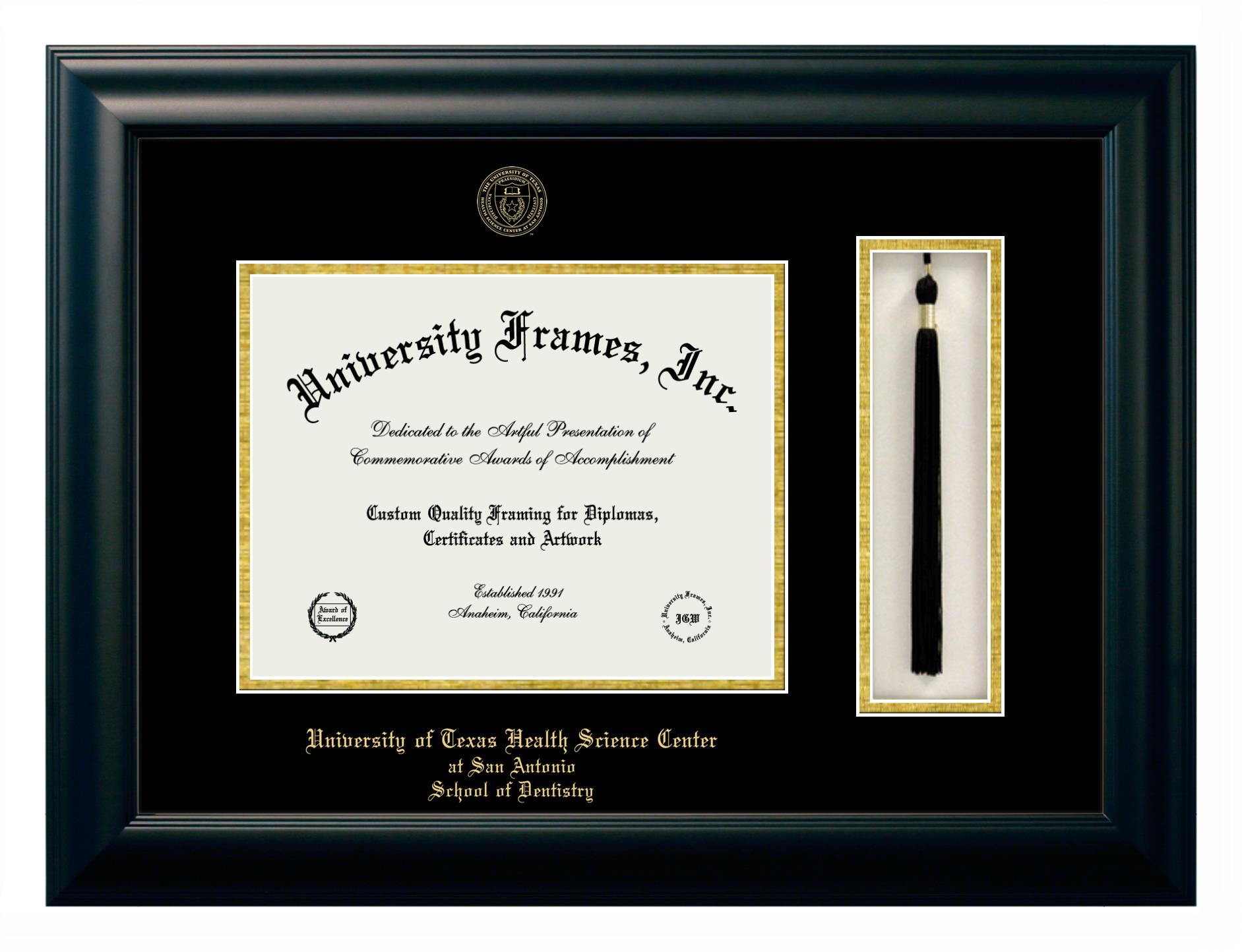 University of Texas Health Science Center at San Antonio School of Dentistry diploma frames and degree frames are the perfect graduation gifts for recent grads, or anyone who wants to preserve and display their hard-earned accomplishments. Our custom diploma frames are specifically made with the official University of Texas Health Science Center at San Antonio School of Dentistry seal and are handcrafted to meet high-quality standards. We guarantee that you will love our graduation frames. Start customizing your frame now!
