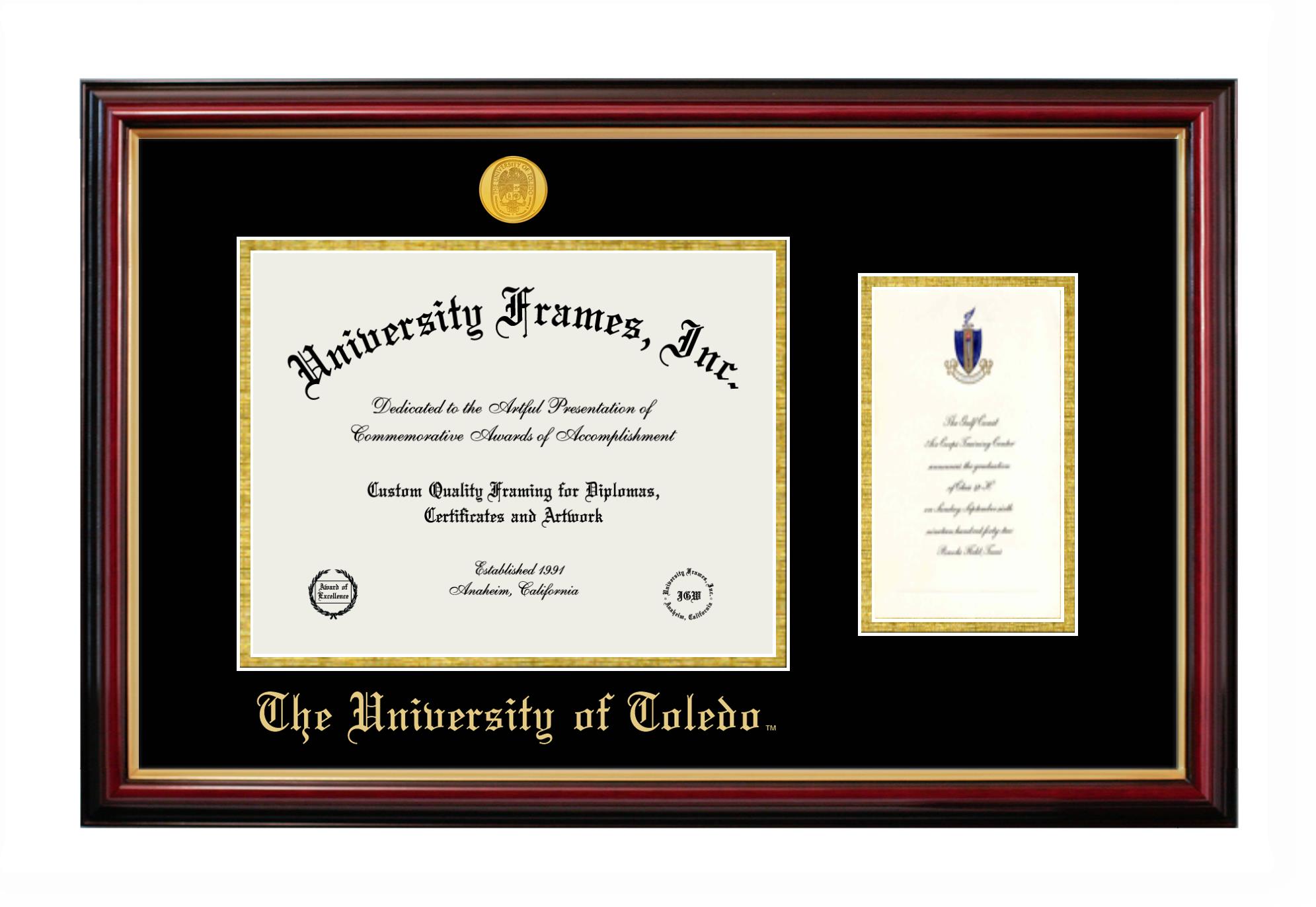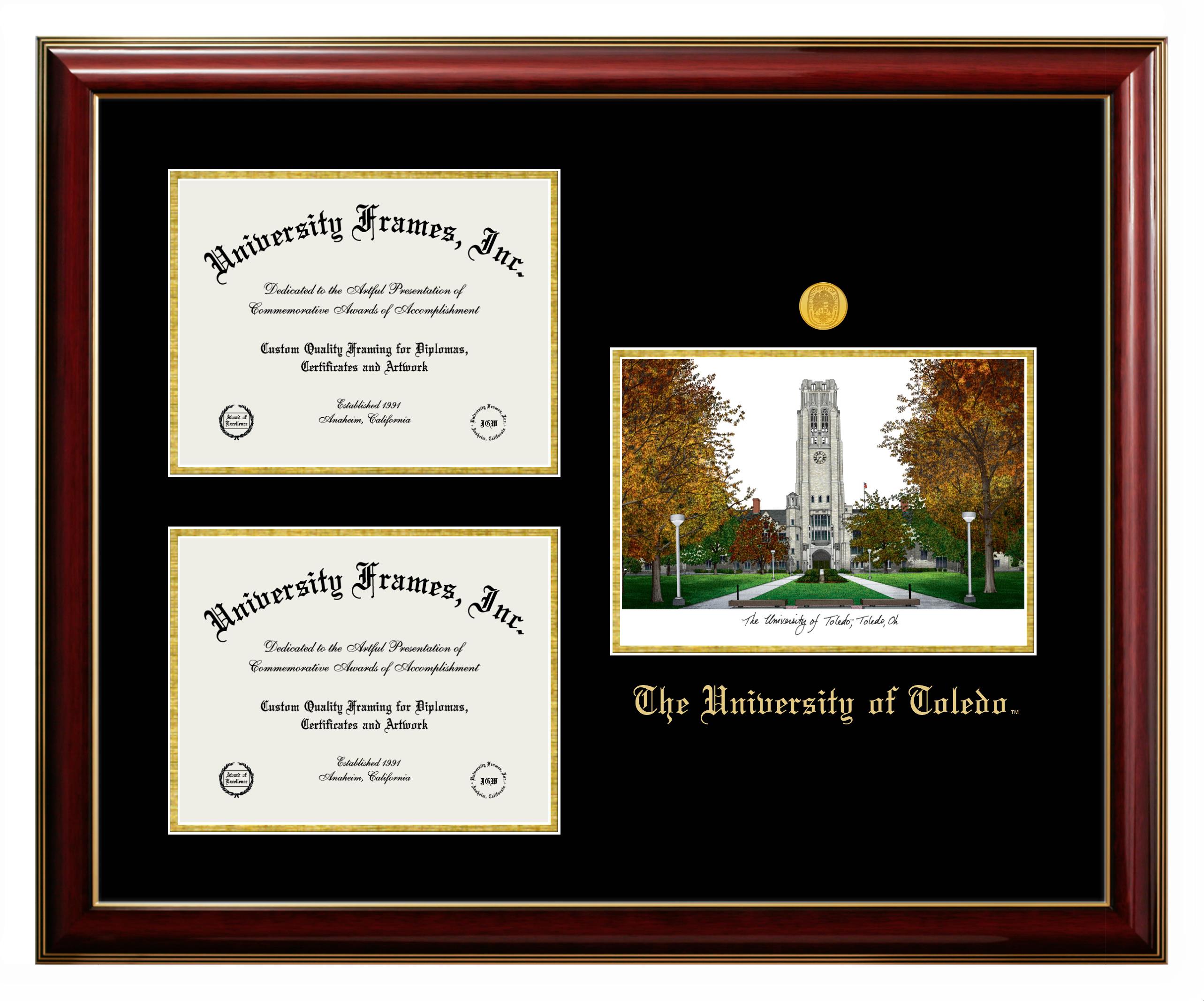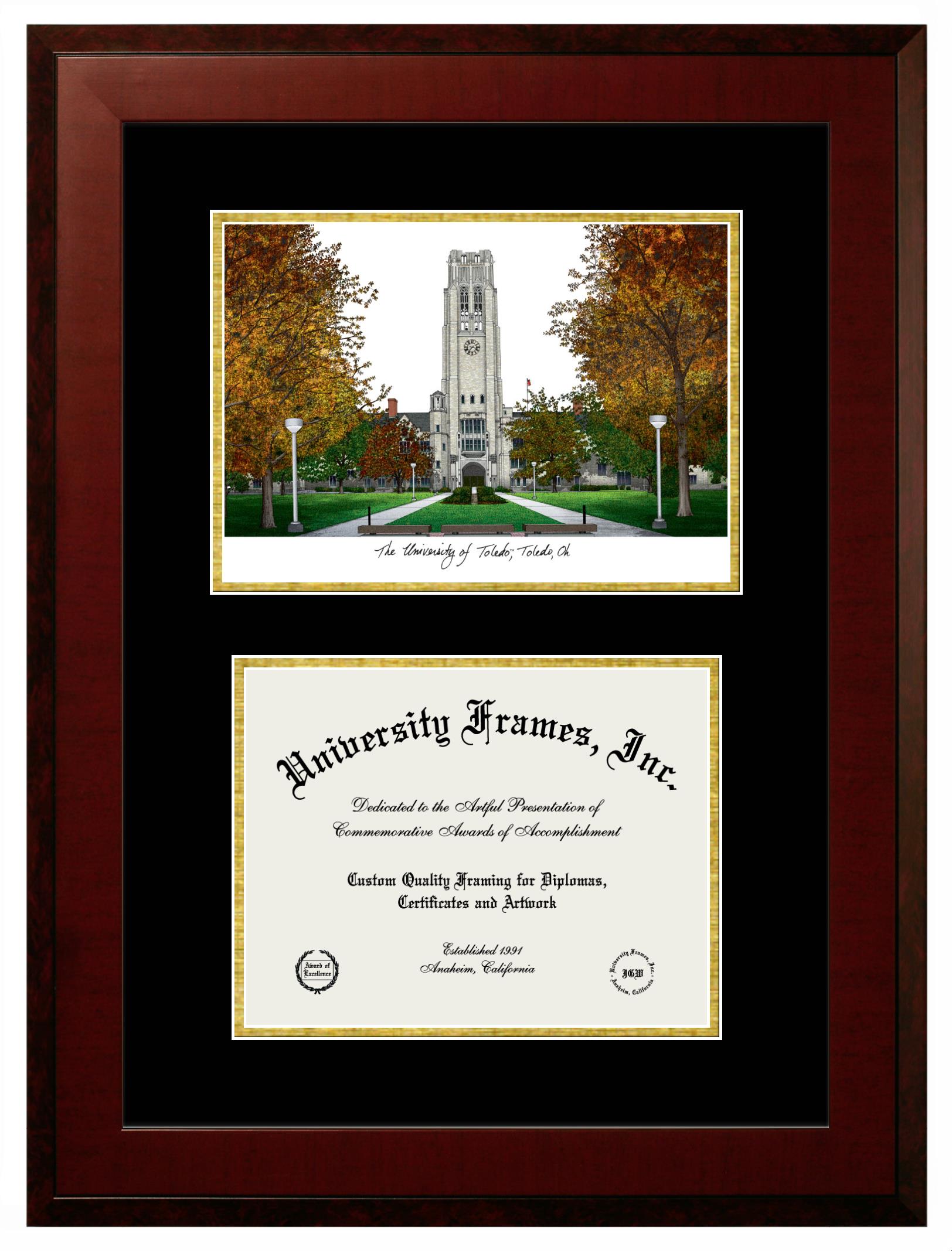 University of Toledo diploma frames and degree frames are the perfect graduation gifts for recent grads, or anyone who wants to preserve and display their hard-earned accomplishments. Our custom diploma frames are specifically made with the official University of Toledo seal and are handcrafted to meet high-quality standards. We guarantee that you will love our graduation frames. Start customizing your frame now!