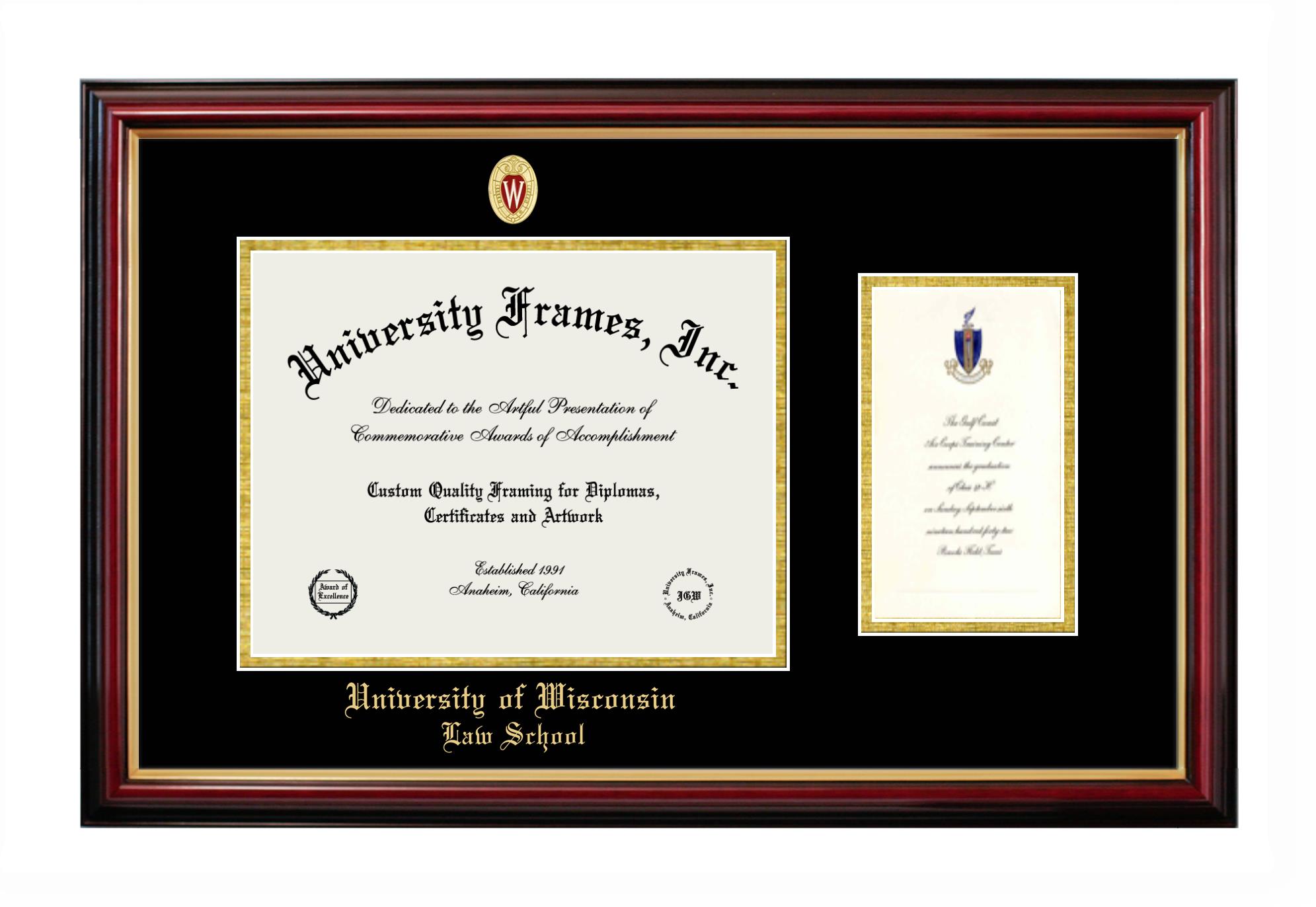 University of Wisconsin (Madison) Law School diploma frames and degree frames are the perfect graduation gifts for recent grads, or anyone who wants to preserve and display their hard-earned accomplishments. Our custom diploma frames are specifically made with the official University of Wisconsin (Madison) Law School seal and are handcrafted to meet high-quality standards. We guarantee that you will love our graduation frames. Start customizing your frame now!
