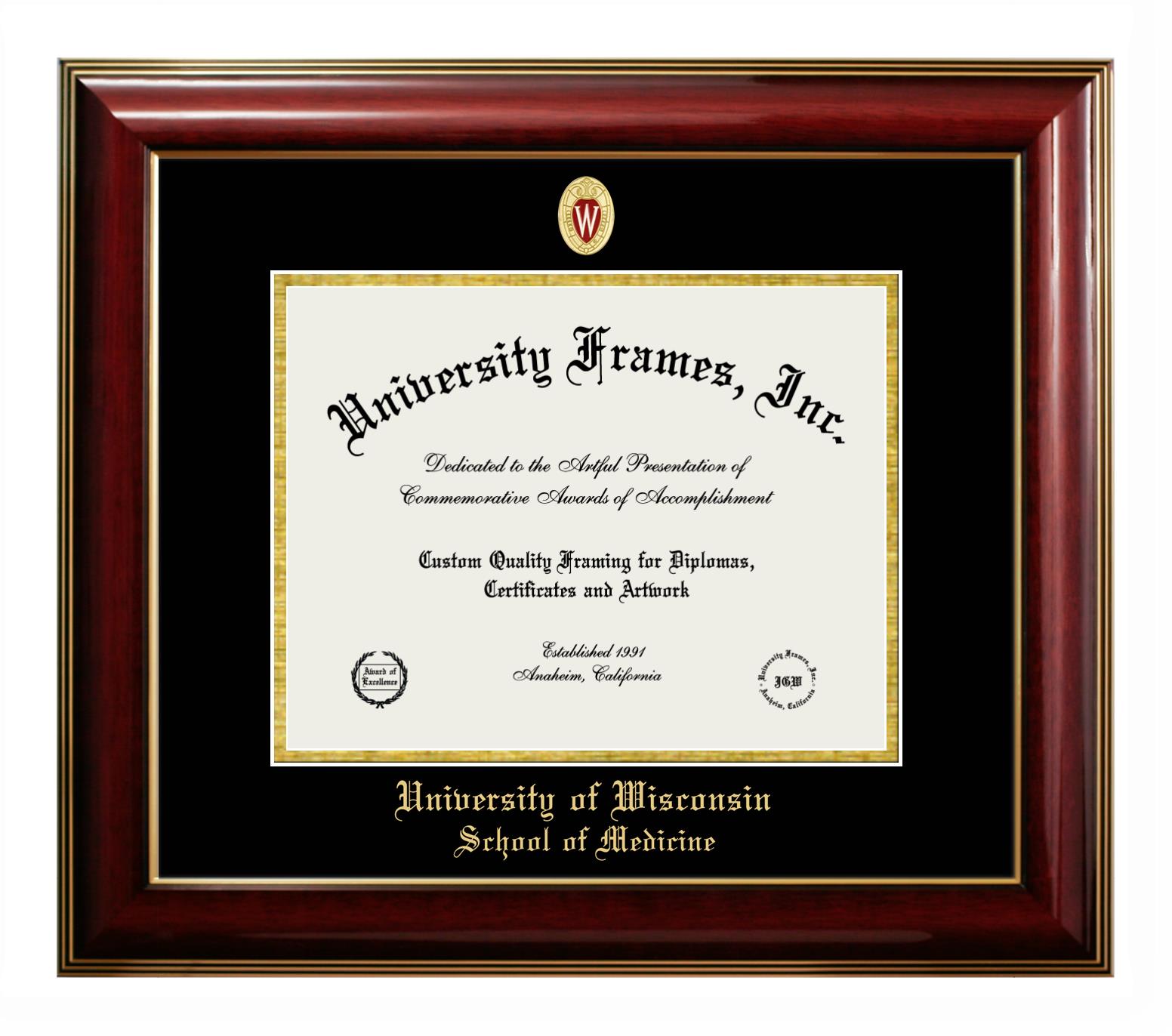University of Wisconsin (Madison) School of Medicine diploma frames and degree frames are the perfect graduation gifts for recent grads, or anyone who wants to preserve and display their hard-earned accomplishments. Our custom diploma frames are specifically made with the official University of Wisconsin (Madison) School of Medicine seal and are handcrafted to meet high-quality standards. We guarantee that you will love our graduation frames. Start customizing your frame now!