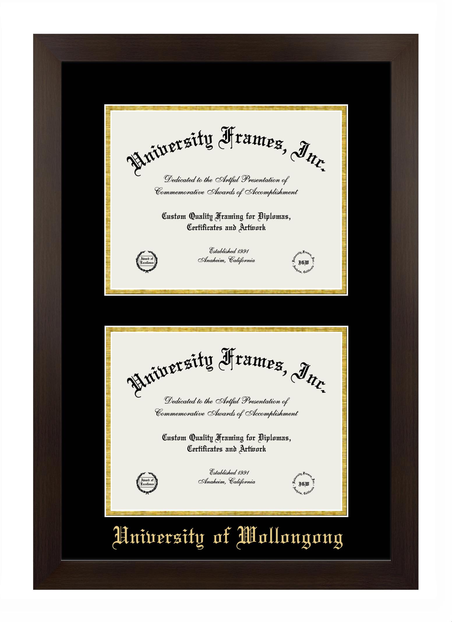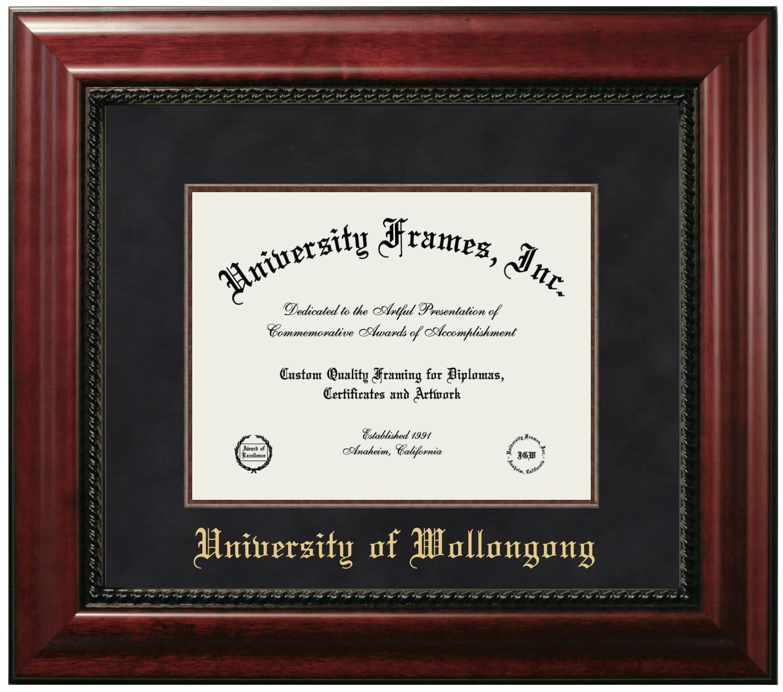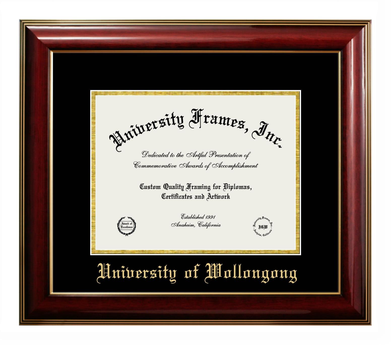 University of Wollongong diploma frames and degree frames are the perfect graduation gifts for recent grads, or anyone who wants to preserve and display their hard-earned accomplishments. Our custom diploma frames are specifically made with the official University of Wollongong seal and are handcrafted to meet high-quality standards. We guarantee that you will love our graduation frames. Start customizing your frame now!