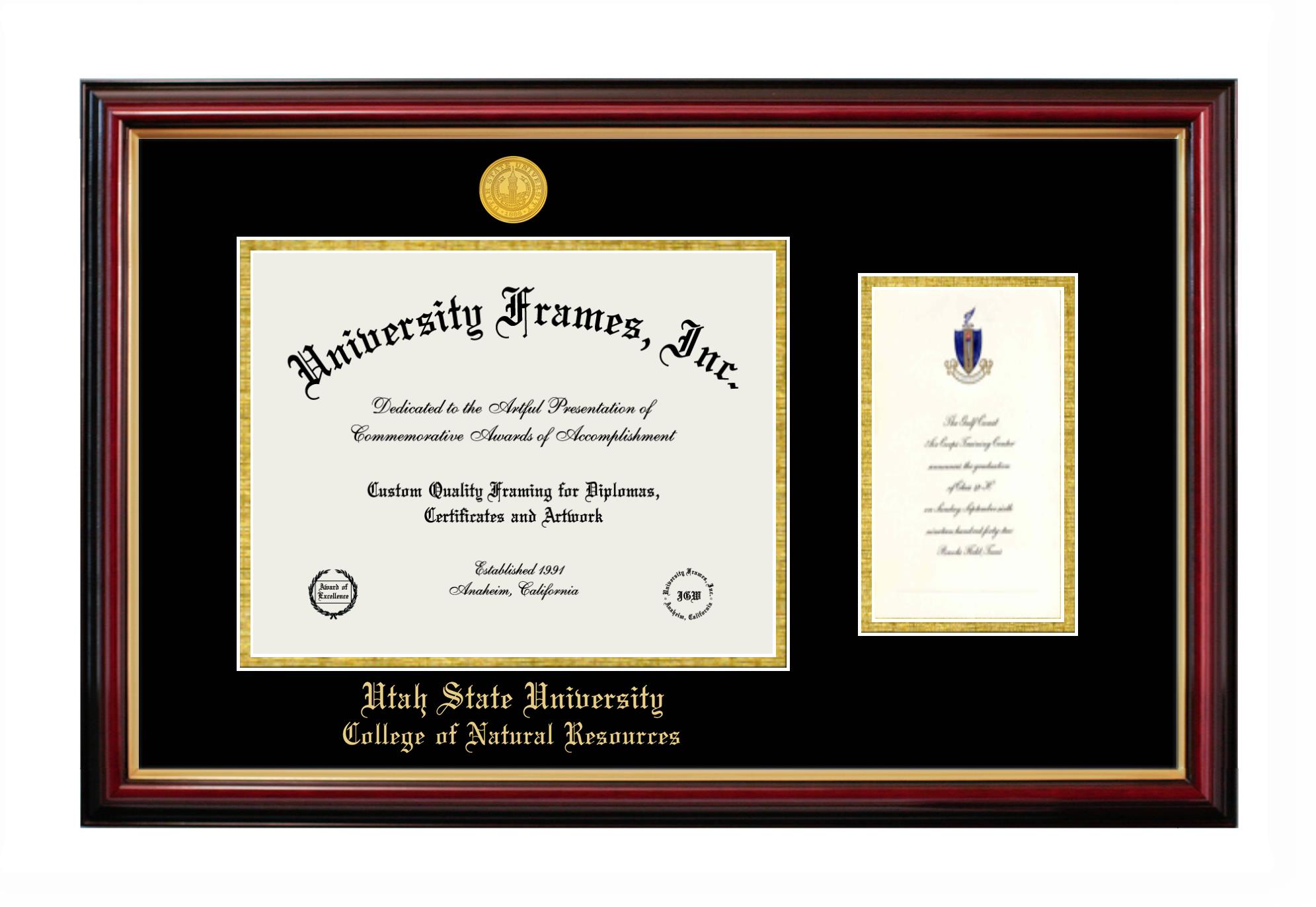 Utah State University College of Natural Resources diploma frames and degree frames are the perfect graduation gifts for recent grads, or anyone who wants to preserve and display their hard-earned accomplishments. Our custom diploma frames are specifically made with the official Utah State University College of Natural Resources seal and are handcrafted to meet high-quality standards. We guarantee that you will love our graduation frames. Start customizing your frame now!