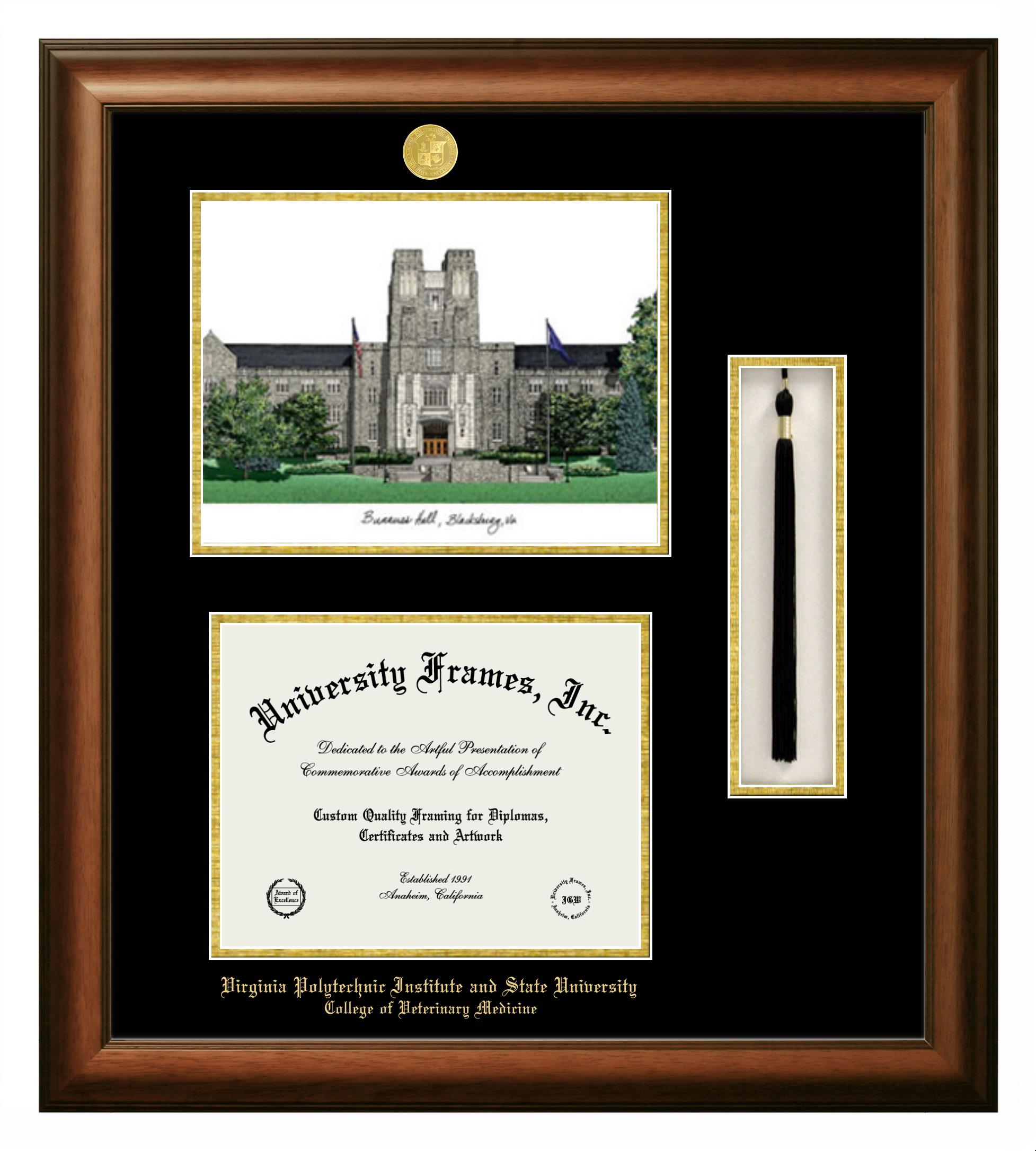 Virginia Polytechnic Institute and State University College of Veterinary Medicine diploma frames and degree frames are the perfect graduation gifts for recent grads, or anyone who wants to preserve and display their hard-earned accomplishments. Our custom diploma frames are specifically made with the official Virginia Polytechnic Institute and State University College of Veterinary Medicine seal and are handcrafted to meet high-quality standards. We guarantee that you will love our graduation frames. Start customizing your frame now!