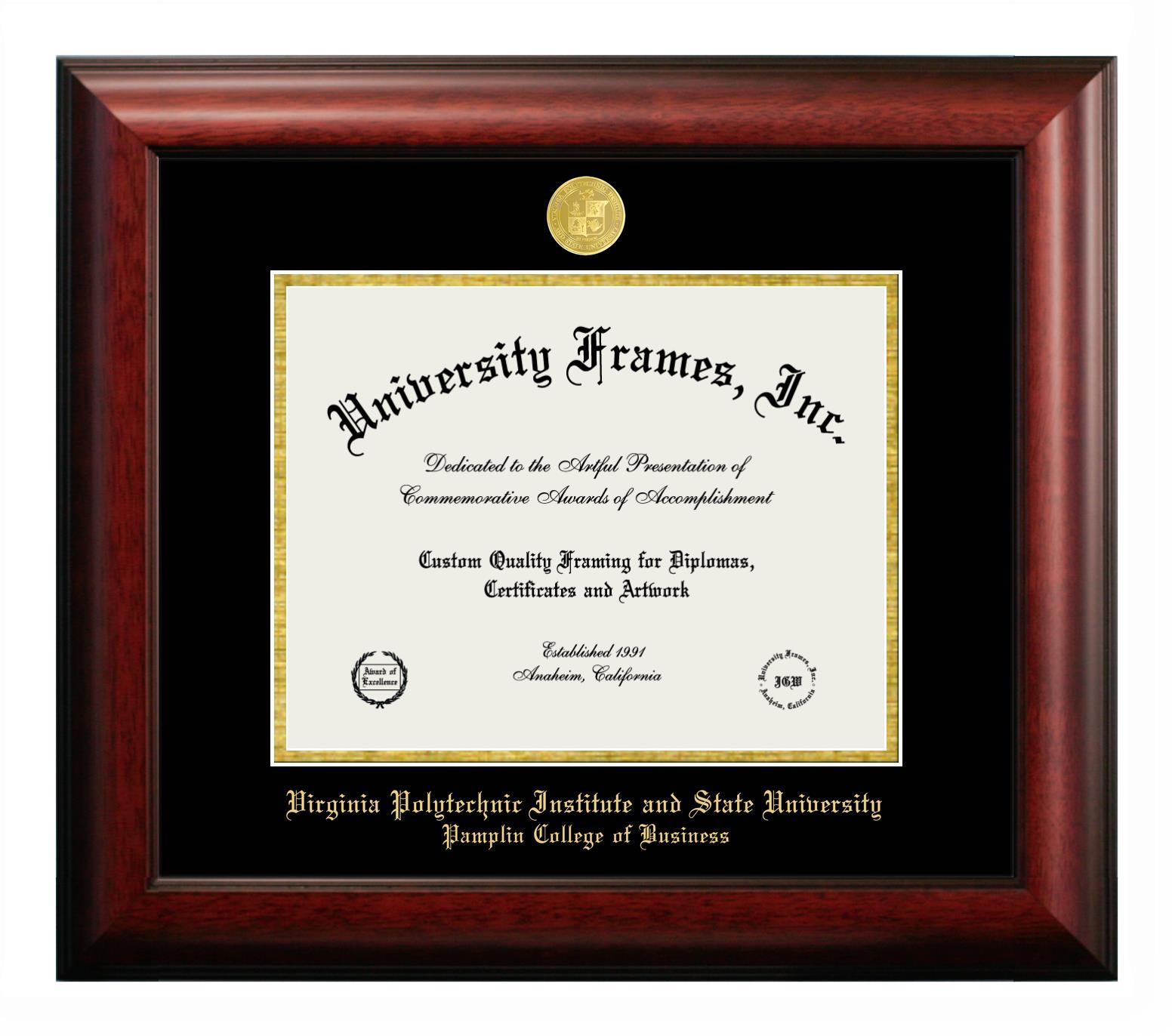 Virginia Polytechnic Institute and State University Pamplin College of Business diploma frames and degree frames are the perfect graduation gifts for recent grads, or anyone who wants to preserve and display their hard-earned accomplishments. Our custom diploma frames are specifically made with the official Virginia Polytechnic Institute and State University Pamplin College of Business seal and are handcrafted to meet high-quality standards. We guarantee that you will love our graduation frames. Start customizing your frame now!