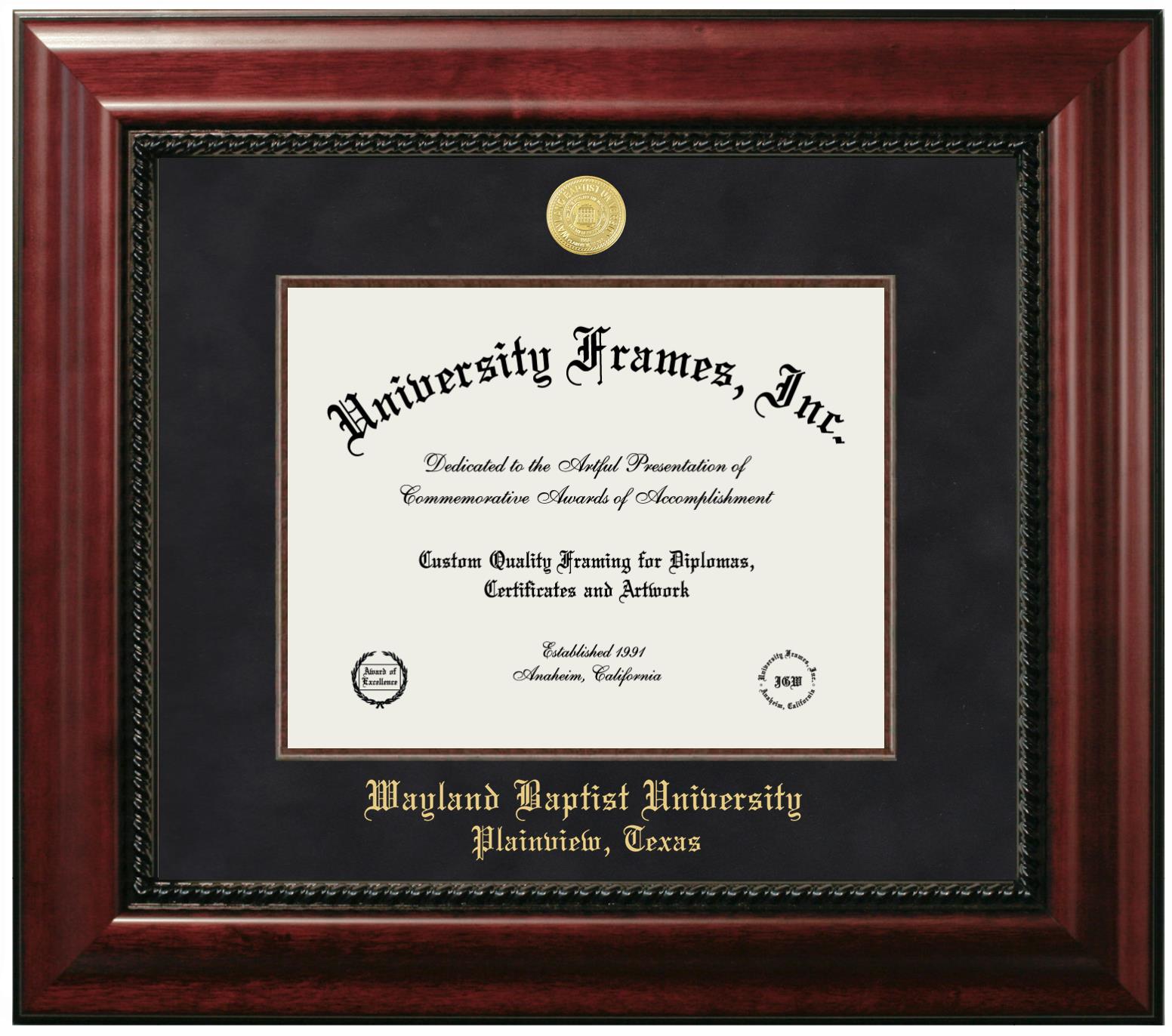 Wayland Baptist University Plainview, Texas diploma frames and degree frames are the perfect graduation gifts for recent grads, or anyone who wants to preserve and display their hard-earned accomplishments. Our custom diploma frames are specifically made with the official Wayland Baptist University Plainview, Texas seal and are handcrafted to meet high-quality standards. We guarantee that you will love our graduation frames. Start customizing your frame now!