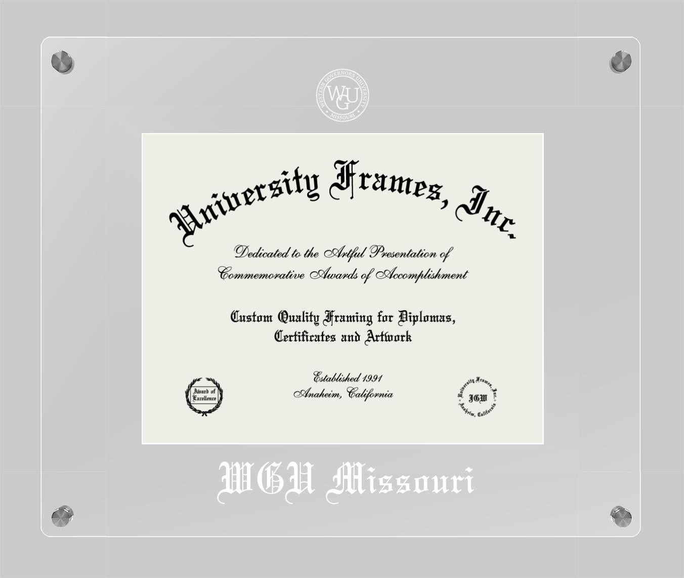 Western Governors University (Missouri) diploma frames and degree frames are the perfect graduation gifts for recent grads, or anyone who wants to preserve and display their hard-earned accomplishments. Our custom diploma frames are specifically made with the official Western Governors University (Missouri) seal and are handcrafted to meet high-quality standards. We guarantee that you will love our graduation frames. Start customizing your frame now!