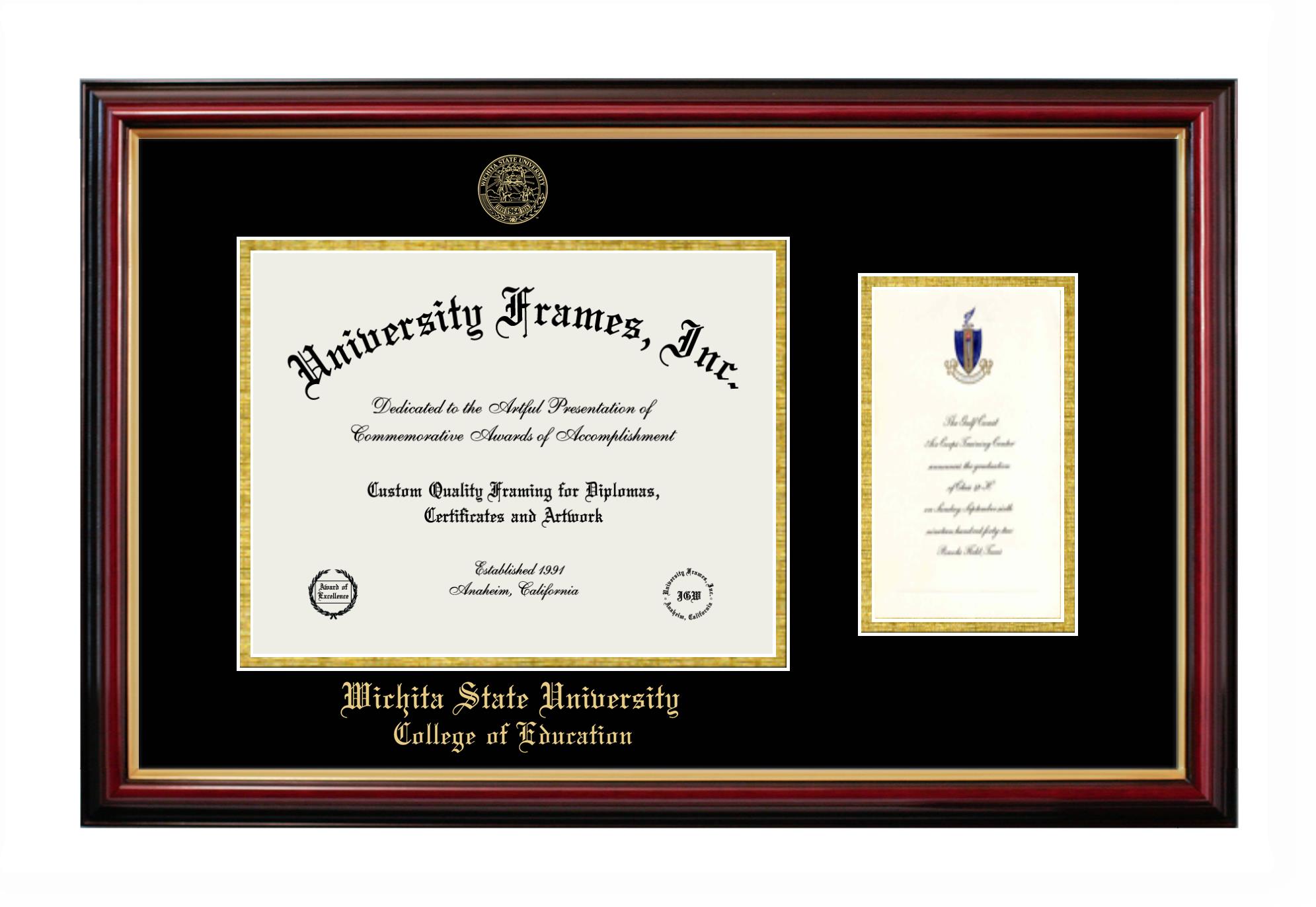 Wichita State University College of Education diploma frames and degree frames are the perfect graduation gifts for recent grads, or anyone who wants to preserve and display their hard-earned accomplishments. Our custom diploma frames are specifically made with the official Wichita State University College of Education seal and are handcrafted to meet high-quality standards. We guarantee that you will love our graduation frames. Start customizing your frame now!